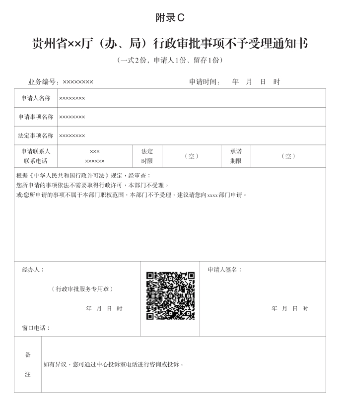 (2)申请事项依法不需要取得行政许可的,应当场出具不予受理通知书(附录C)。