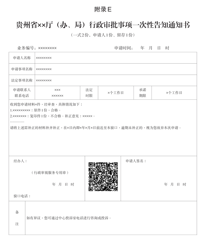 (6)申请材料不齐全或不符合法定程序且不能当场补齐补正,能当场一次性告知的,应当场出具一次性告知通知书(附录E),不能够当场一次性告知的,应当场出具收件通知书(附录B),并在五日内出具一次性告知通知书(附录E),详实详尽地书面告知申请人需要补正的全部材料,逾期不告知的,自收到申请材料之日起即为受理。