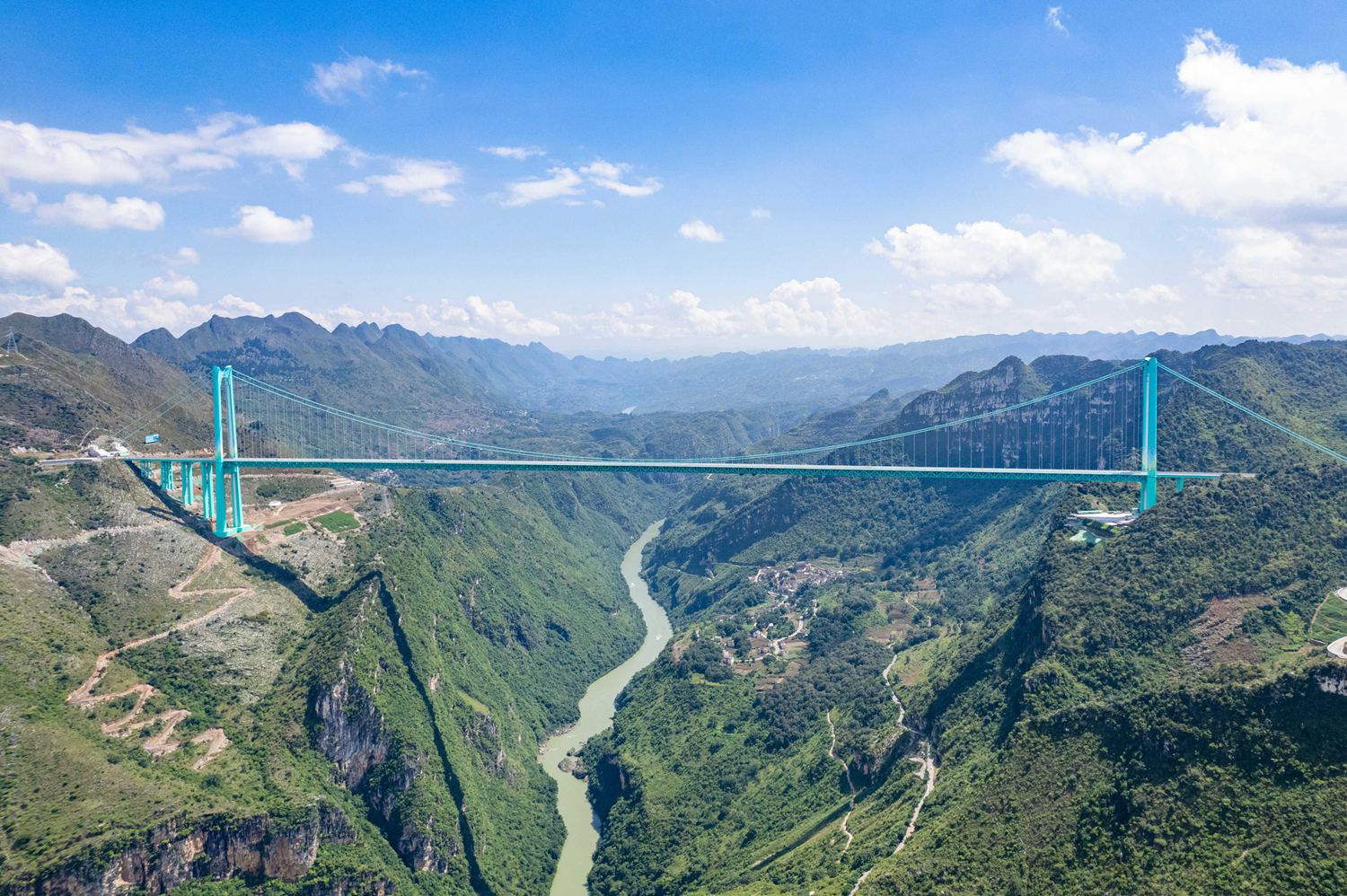 花江峡谷大桥全长2890米,主桥跨径1420米,桥面至水面高度625米,创造了桥梁主跨跨径山区最大、桥面至水面高度世界最高等多项世界纪录,对完善我省西部交通网络、推动产业融合、促进区域经济发展具有重要意义。